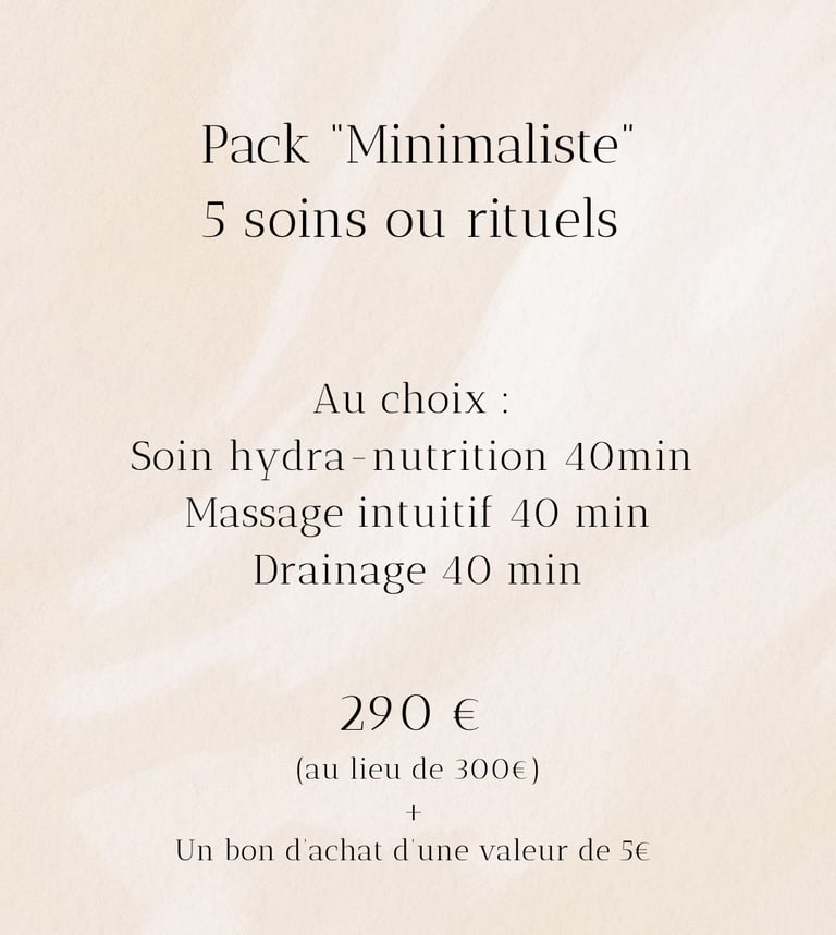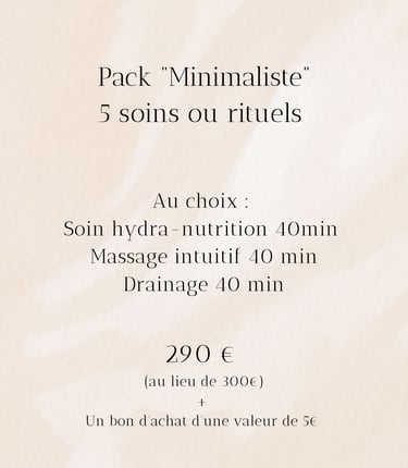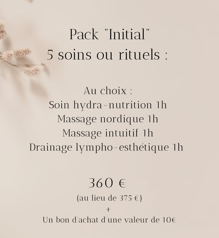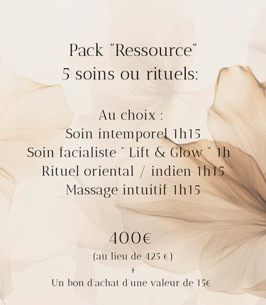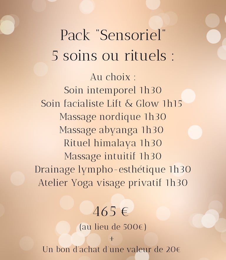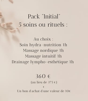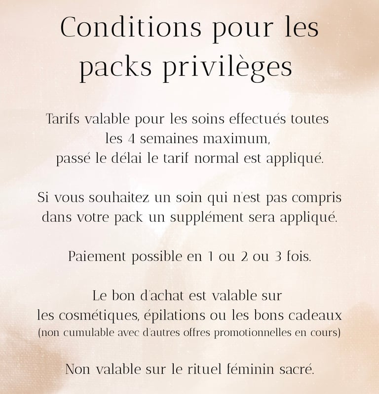 Je vous propose 5 packs privilèges pour découvrir ou redécouvrir vos soins préférés à un tarif préférentiel. Conditions ci- dessous :